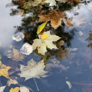Zu dem einen Foto mit den Blättern auf unserem oberen Amphibienteich passt ein sehr schönes, in diesem Dezember 70 Jahre alt werdendes Werk des niederländischen Grafikers H C Escher, mit dem Titel „Drei Welten“.