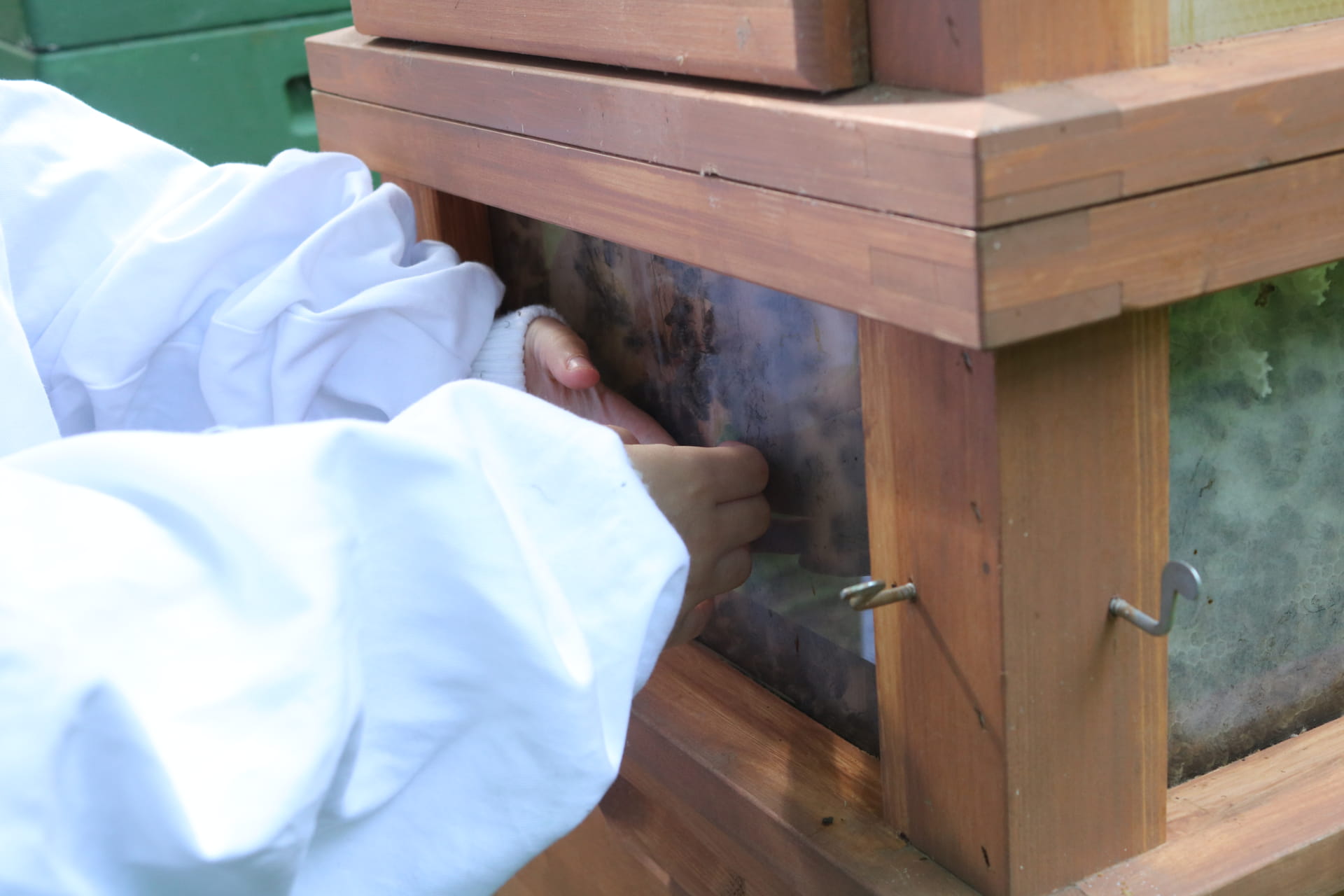 Während eines von der Deutschen Postcodelotterie geförderten Kurses, betrachten Kinder in Imkerbekleidung eine Schaubeute.