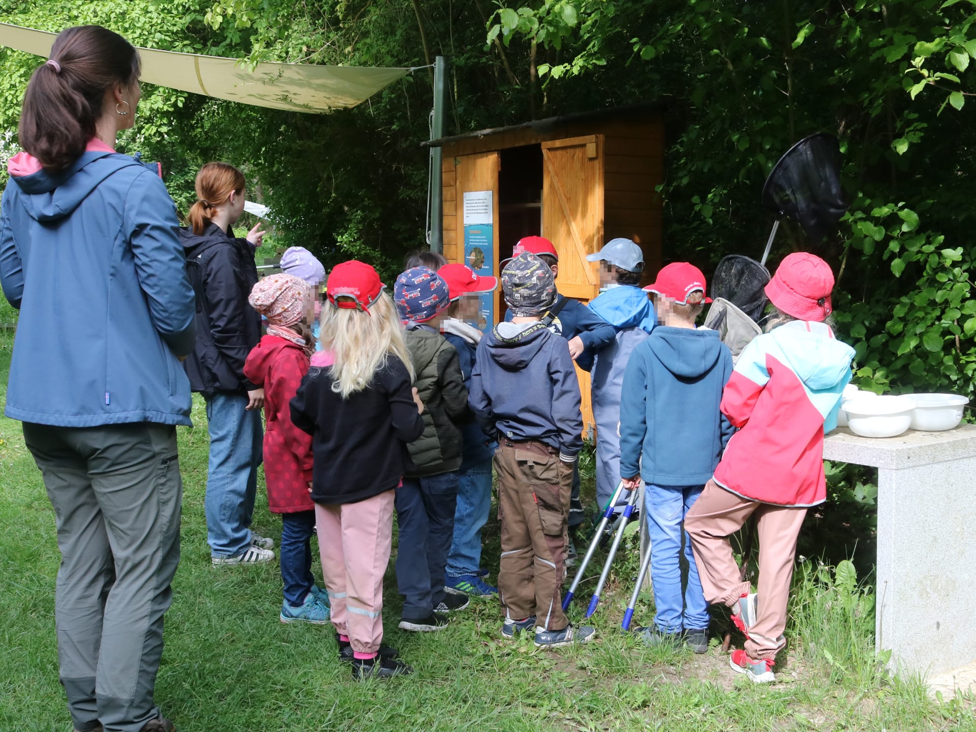 Kinder lauschen des Ausführungen zum Keschern im Teich